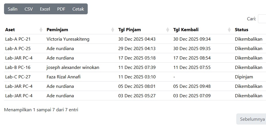 Di sisi lain, laporan aktivitas peminjaman aset komputer menunjukkan dampak positif yang signifikan. Sistem mencatat bahwa fasilitas peminjaman PC per unit terus dimanfaatkan oleh mahasiswa untuk menunjang kebutuhan studi mereka di luar jam praktikum terjadwal.