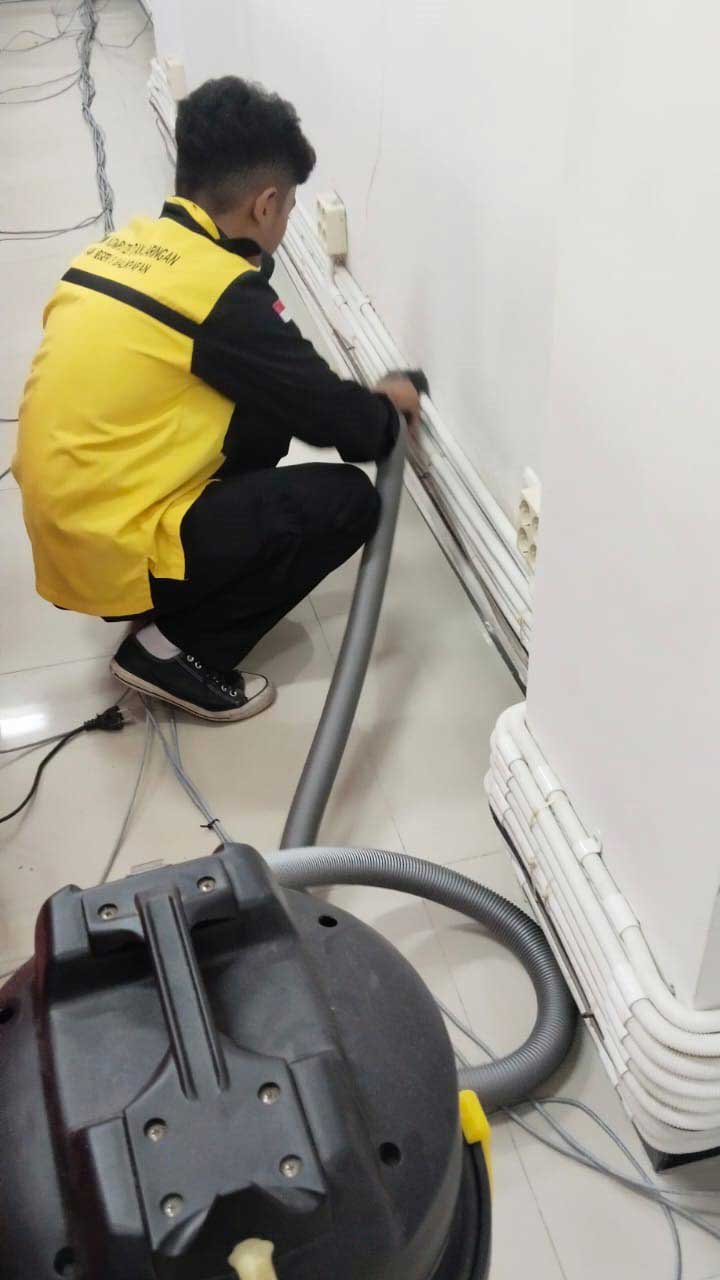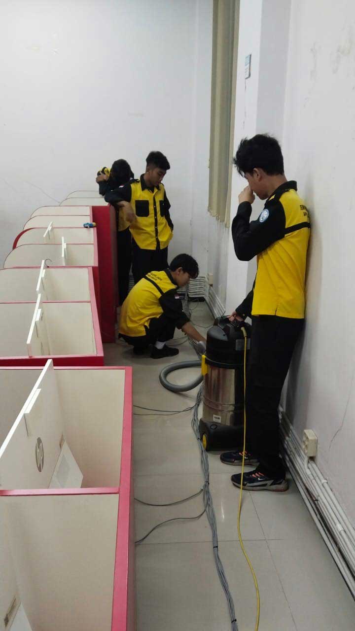 Para siswa magang, yang mengenakan seragam praktek berwarna kuning dan hitam, tampak serius melaksanakan tugas. Sebagian fokus pada membersihkan debu-debu yang menumpuk di sela-sela bilik komputer menggunakan vacuum cleaner, dan yang lain berkonsentrasi pada penataan ulang kabel-kabel jaringan.